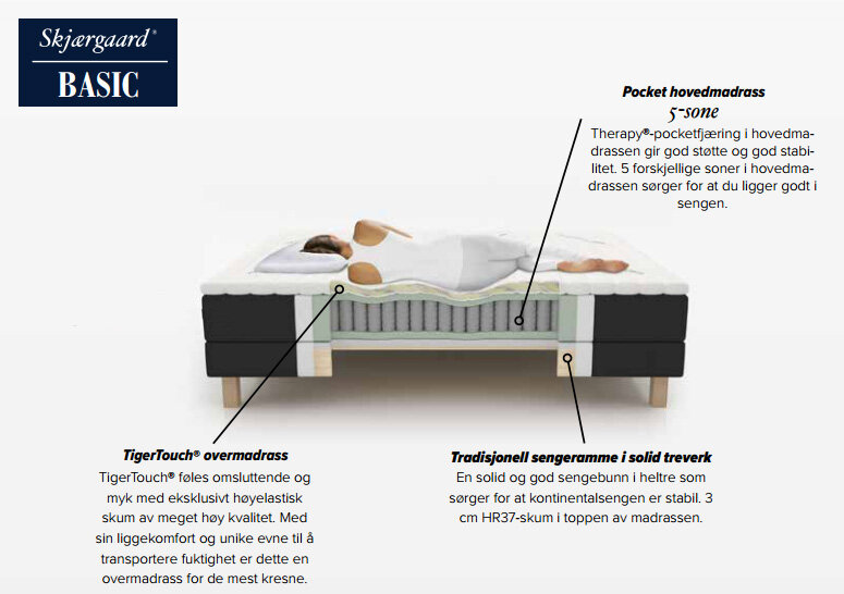 Denne kobinasjonen gjør Skjærgaard® Basic kontinentalseng til en elegant, slank, meget stabil og komfortabel seng. Basic leveres med vår Tigertouch overmadrass på hele 8 cm som standard. Dette sammen med Therapy®-pocketfjæring i 7 ulike soner gir kontinentalmadrassen den myke og trykkavlastende overflaten den er berømt for, og samtidig fantastisk god støtte til korsrygg og hofteparti. Basic kontinentalseng er trukket med eksklusive møbeltekstiler som kan vaskes i maskin på håndvaskprogram. Trekket på overmadrassen kan vaskes på 60 grader.