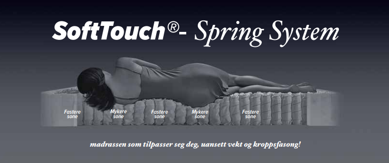 - 7 sone progressive SoftTouch-pocket fjæring i hovedmadrassen(330/M2). Med sine unike egenskaper, gjør SoftTouch fjærene at du føler en fantastisk myk velkomst når du legger deg i sengen, samtidig som den progressive fjæren tilbyr unik og presis støtte når din optimale liggestilling er nådd.