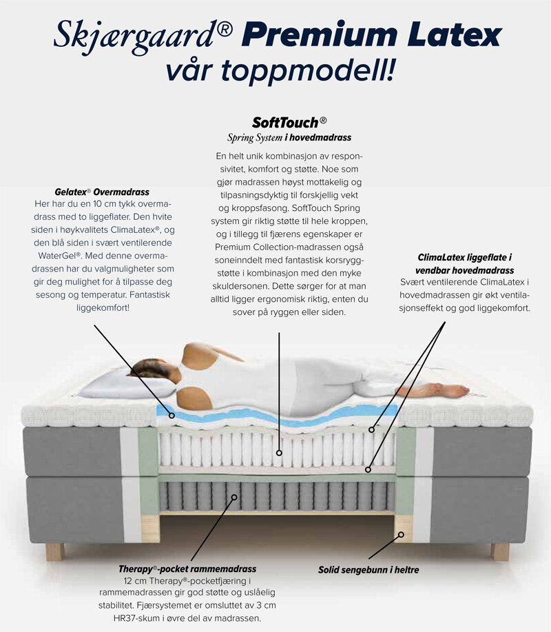 Skjærgaard® Premium Latex leveres med Skjærgaards® beste og mest fleksible fjærsystem. SoftTouch® (15 cm) har korsryggstøtte og myk skuldersone som gjør at kroppen alltid synker behagelig ned i madrassen. Skjærgaard Premium leveres med ClimaLatex® i den vendbare hovedmadrassen, som i kombinasjon med vår vendbare Gelatex® overmadrass gir deg den aller beste liggekomfort.