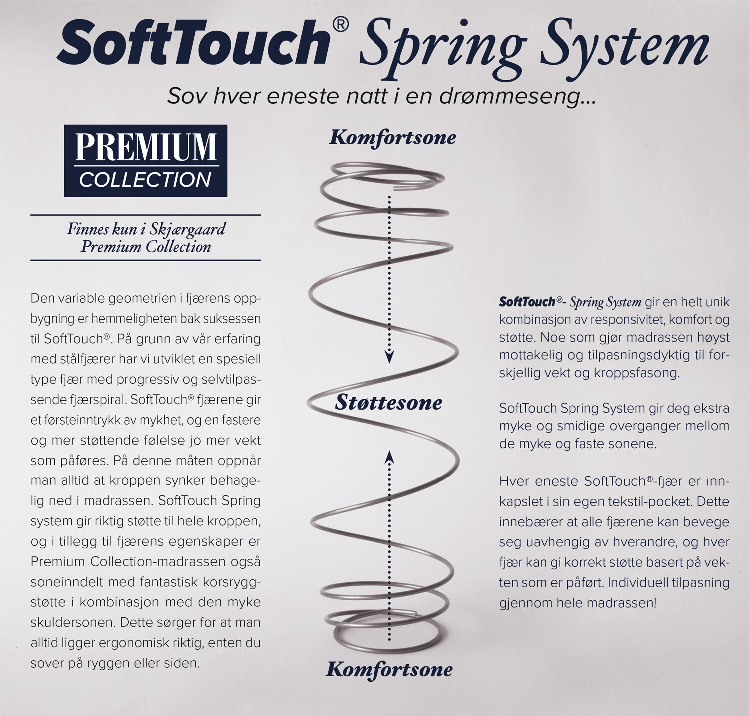 En helt unik kombinasjon av responsivitet, komfort og støtte. Noe som gjør madrassen høyst mottakelig og tilpasningsdyktig til forskjellig vekt og kroppsfasong. SoftTouch Spring system gir riktig støtte til hele kroppen, og i tillegg til fjærens egenskaper er Premium Collection-madrassen også soneinndelt med fantastisk korsryggstøtte i kombinasjon med den myke skuldersonen. Dette sørger for at man alltid ligger ergonomisk riktig, enten du sover på ryggen eller siden.