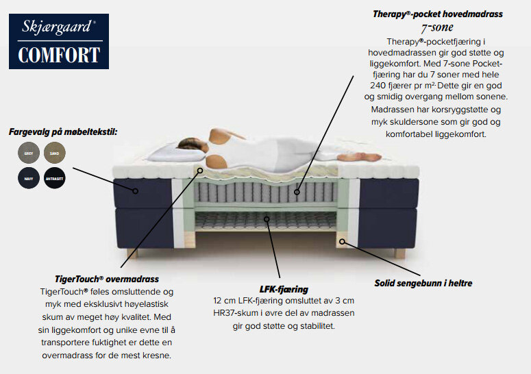 Therapy®-pocketfjæring i hovedmadrassen gir god støtte og liggekomfort. Med 7-sone Pocket-fjæring har du 7 soner med hele 240 fjærer pr m2. Dette gir en god og smidig overgang mellom sonene. Madrassen har korsryggstøtte og myk skuldersone som gir god og komfortabel liggekomfort.